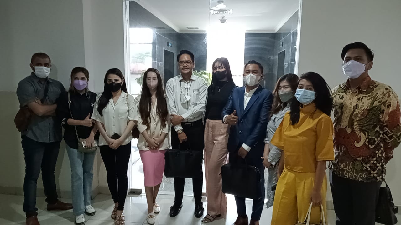 Kuasa Hukum Reseller alat-alat kesehatan Muhammad Kusuma Sejati SH (pertama dari kiri) foto bersama kliennya Angela Amora (tengah) dan anggota tim Kuasa Hukumnya di luar ruang Mudjono, Pengadilan Niaga pada PN Jakpus, Jalan Bungur, Kemayoran, Selasa siang (18/01/2022). (Foto : Murgap Harahap)