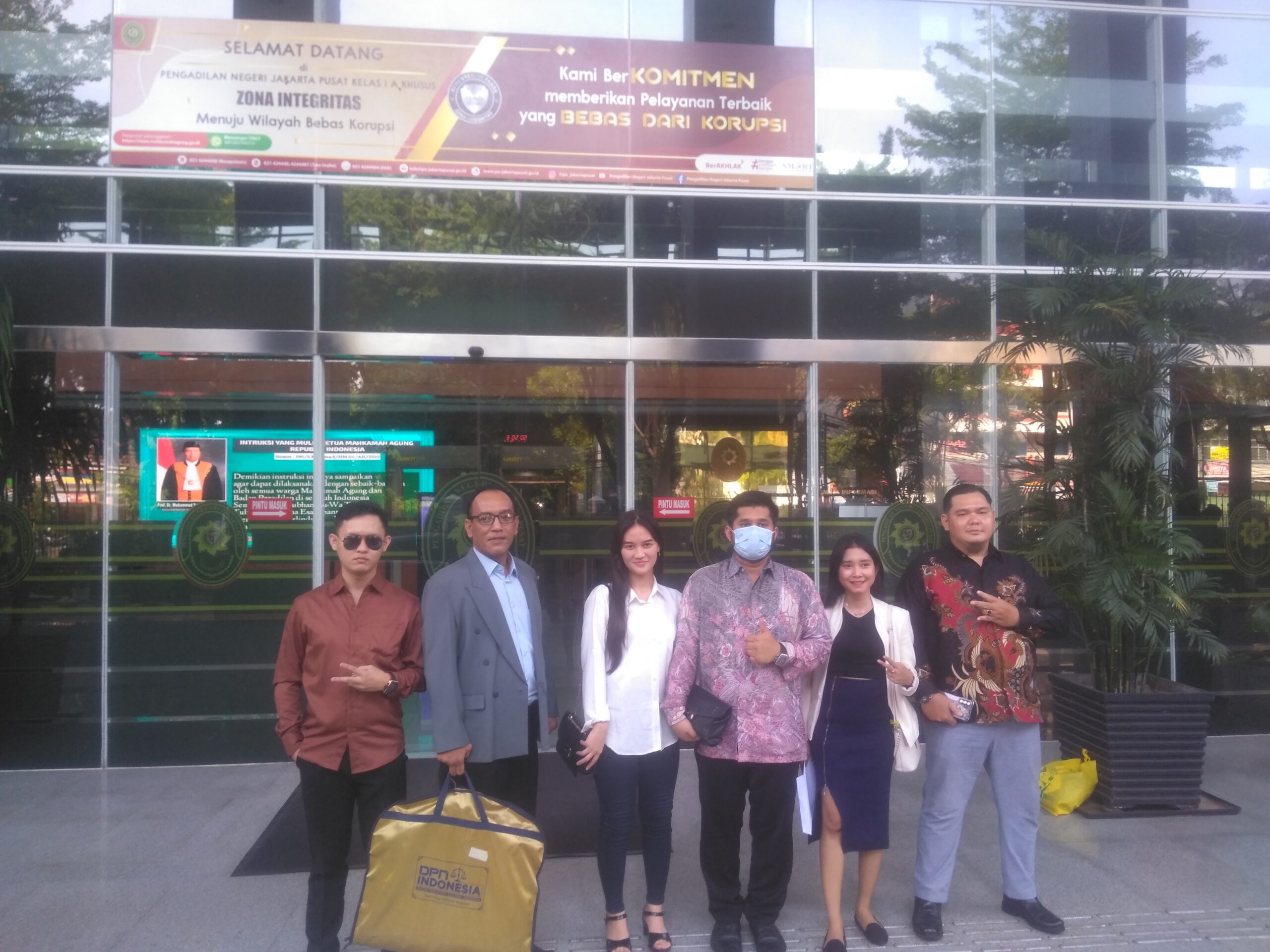 Kuasa Hukum terdakwa Dodi Wahyudi, Arhami Satya Siregar SH MKn (ketiga dari kanan) foto bersama anggota tim Kuasa Hukumnya Tansil SH (pertama dari kanan), Toman M Silalahi SH (kedua dari kiri) dan Jannev Octavia serta lainnya di teras PN Jakpus, Jalan Bungur, Kemayoran, Jakpus, Kamis (16/11/2023). (Foto : Murgap Harahap)