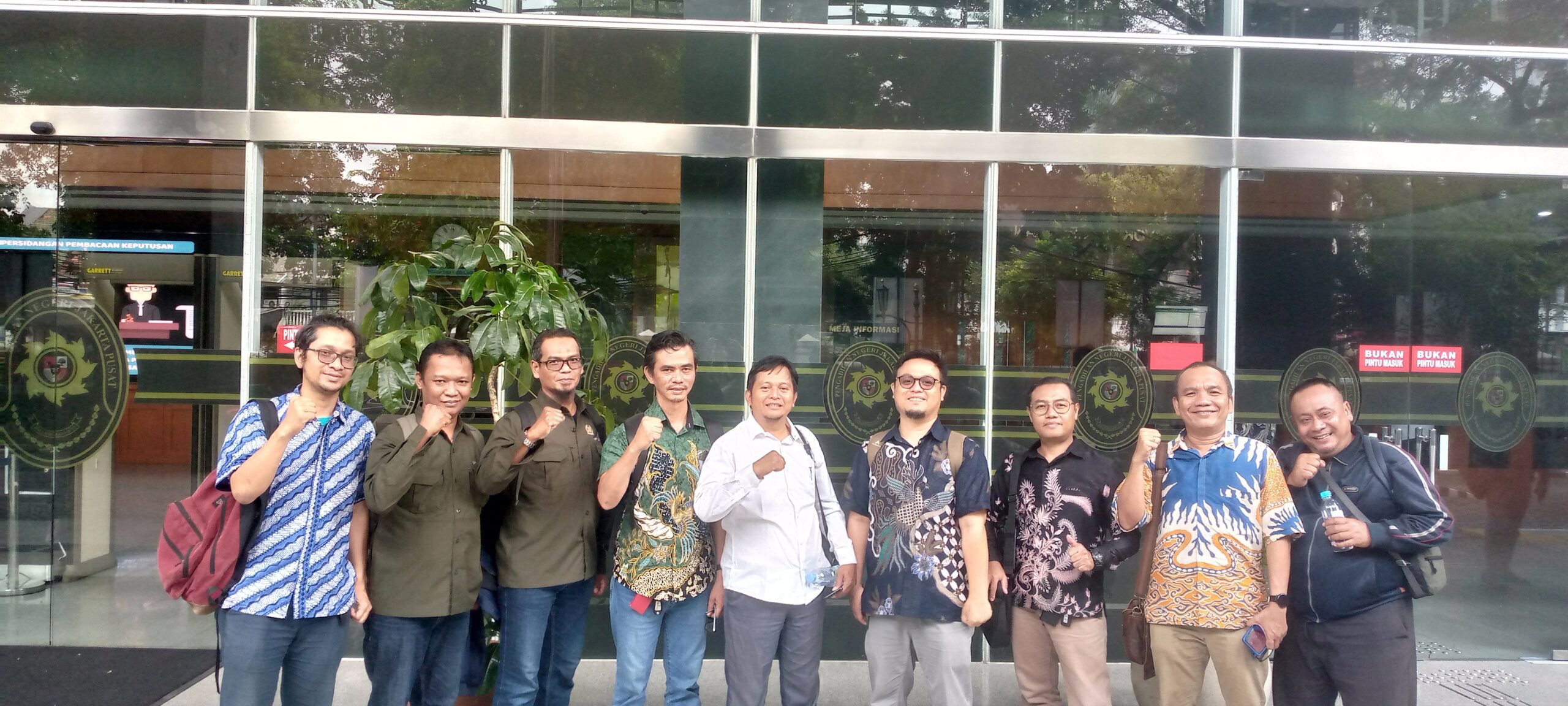 Ketum SPN Suyanto (ketiga dari kiri) foto bersama Ketum SP Solusi Bangun indonesia (SBI) Kemas M Ridzwan (keempat dari kiri) dan Yayan (kedua dari kanan), Dalail SH dari Sarbumusi (tengah), Kuswanto, Albert, Prima, Raden Ismail Haq dan lainnya, di teras PN Jakpus, Jalan Bungur, Kemayoran, Selasa (19/08/2025). (Foto : Murgap Harahap)