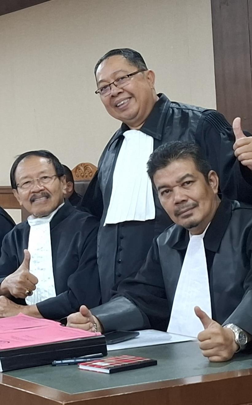 Kuasa Hukum terdakwa pemilik EO GR Pro GAR, Misfuryadi Basrie SH (tengah) foto bersama anggota tim Kuasa Hukumnya Barens Damanik SH (pertama dari kanan), Priyagus Widodo SH di ruang Prof Dr Kusumah Atmaja SH MH, Pengadilan Tipikor pada PN Jakpus, Jalan Bungur, Kemayoran, Selasa (30/09/2025). (Foto : Murgap Harahap)