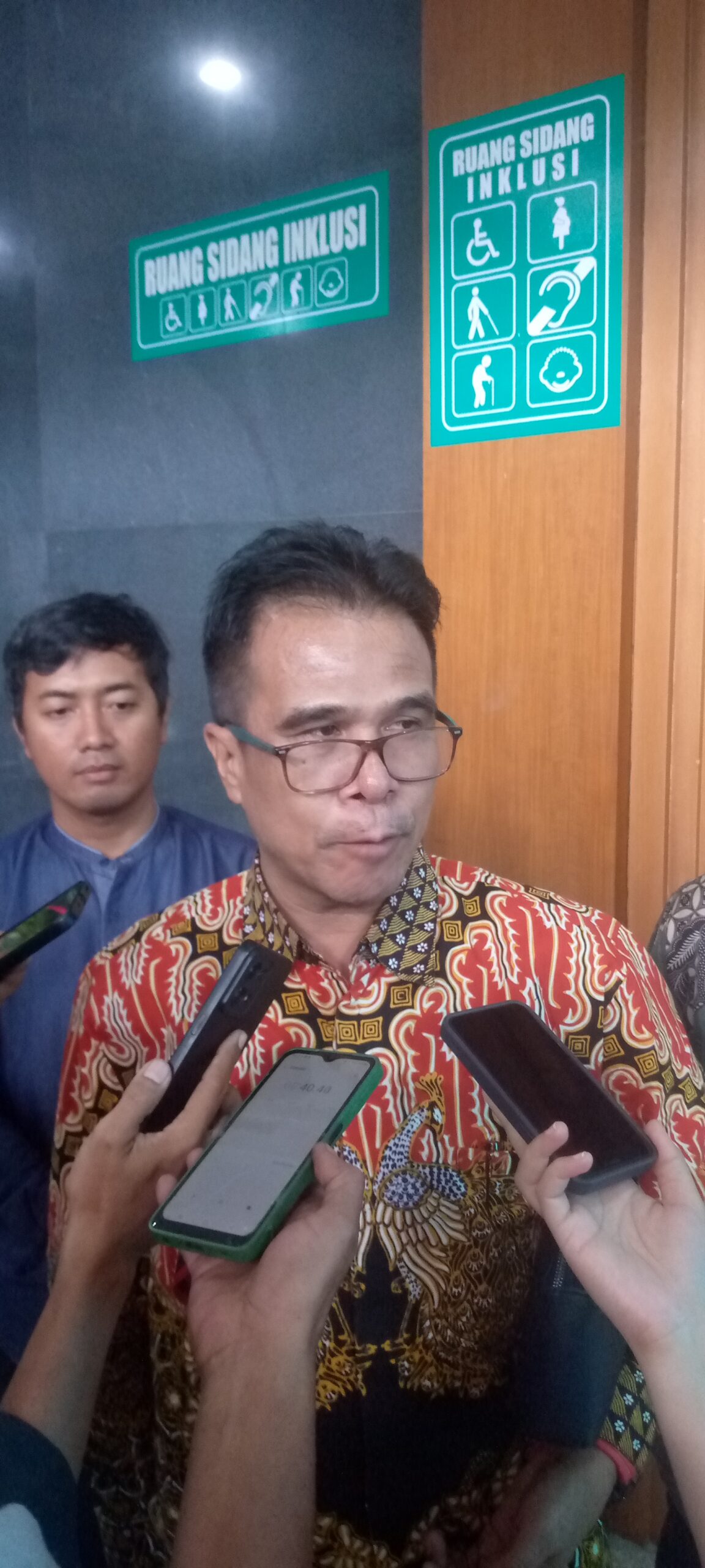 Kuasa Hukum terdakwa pengumpul data debitur Kancab BNI 46 Daan Mogot-Kota Lia Hertika Hudayani,, Erdi Surbakti SH saat jumpa pers di sela acara sidang di luar ruang Prof Dr Kusumah Atmadja SH MH, Pengadilan Tipikor pada PN Jakpus, Jalan Bungur, Kemayoran, Selasa (07/10/2025). (Foto : Murgap Harahap)