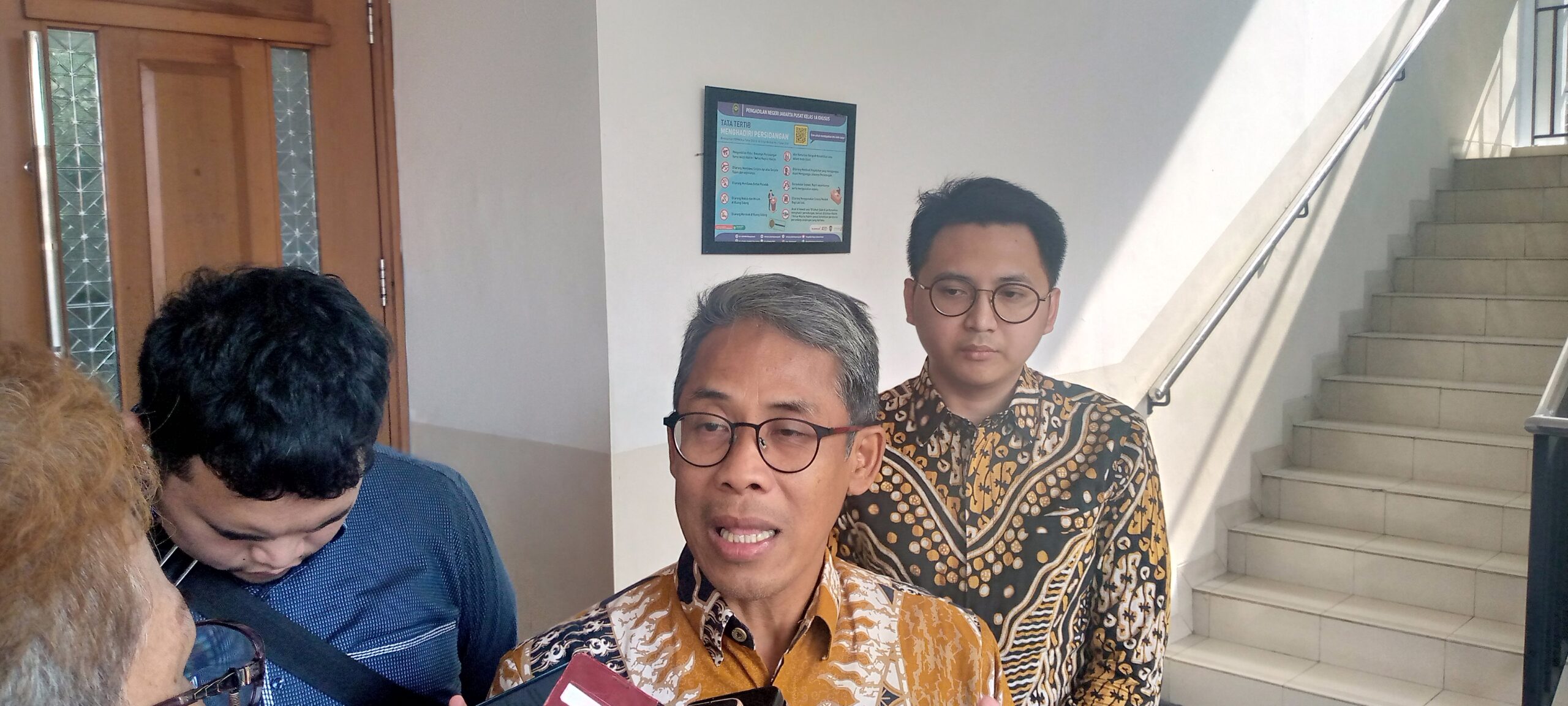 Kuasa Hukum terdakwa Dirut PT BMM Agus Sudjatmoko SH MH (tengah) didampingi anggota tim Kuasa Hukumnya saat jumpa pers di luar ruang Wirjono Projodikoro 2, Pengadilan Tipikor pada PN Jakpus, Jalan Bungur, Kemayoran, Rabu (15/10/2025). (Foto : Murgap Harahap)