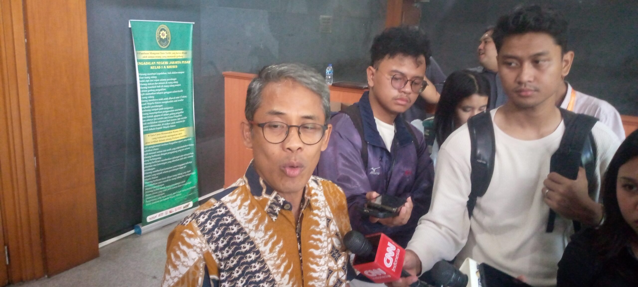 Kuasa Hukum terdakwa Dirut PT BMM Hans Falita Utama, Agus Sudjatmoko SH MH ketika jumpa pers di luar ruang Prof Dr HM Hatta Ali SH MH, Pengadilan Tipikor pada PN Jakpus, Jalan Bungur, Kemayoran, Kamis (30/10/2025). (Foto : Murgap Harahap)