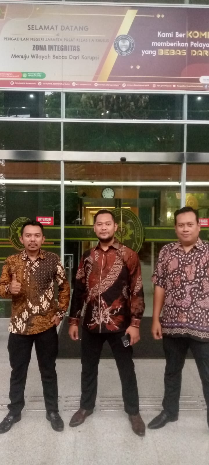 Adhetya Mareza Syahputra SH (tengah) foto bersama anggota tim Kuasa Hukumnya di teras Pengadilan Tipikor pada PN Jakpus, Jalan Bungur, Kemayoran, Jum’at (06/02/2026). (Foto : Murgap Harahap)