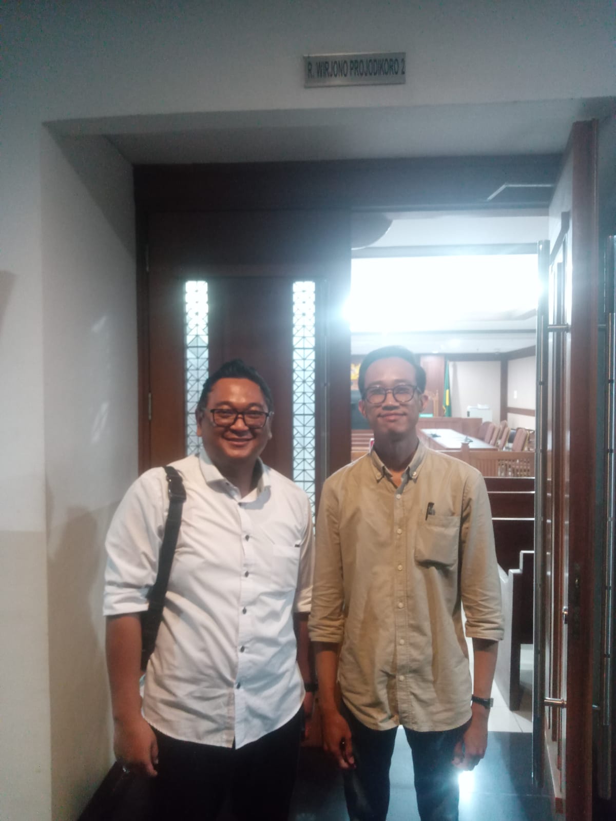 Kuasa Hukum terdakwa Verifikator di Kemnaker RI Jamal Shodiqin, Awan Darmawan SH MH (pertama dari kanan) foto bersama anggota tim Kuasa Hukumnya Khairudin Azaari SH di luar ruang Wirjono Projodikoro 2, Pengadilan Tipikor pada PN Jakpus, Jalan Bungur, Kemayoran, Kamis (12/02/2026). (Foto : Murgap Harahap)